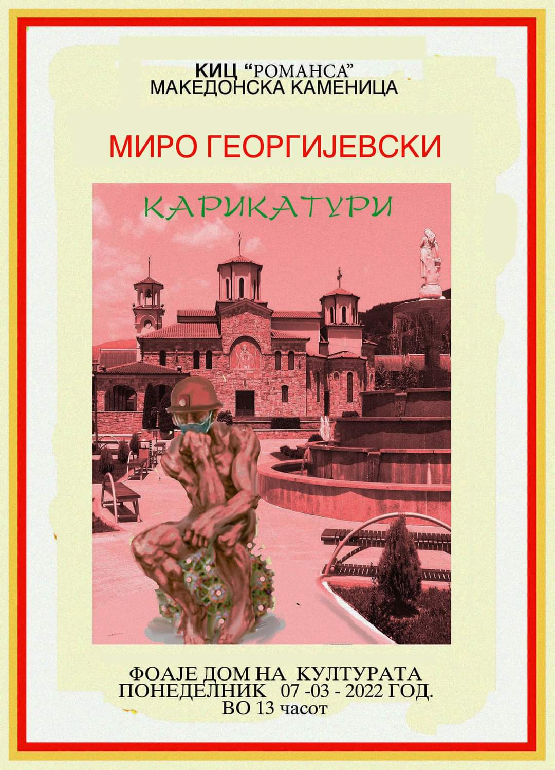 Во понеделник, на 7 март, со почеток од 13 часот, во фоајето на Дом на Култура – Македонска Каменица ке биде отворена Ликовната изложба на еден од најпознатите македонски и светски карикатуристи Миро Георгијевски со наслов “Корона”