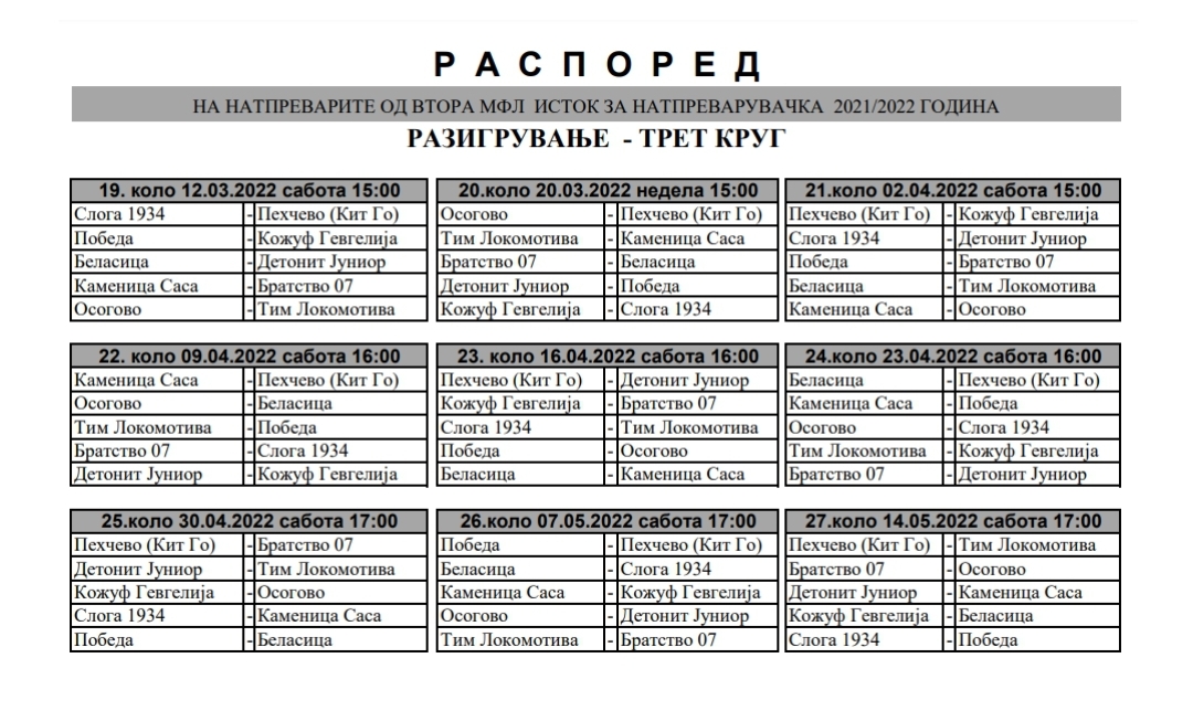 По завршувањето на мечевите од 18.коло во ВМФЛ – ЗАПАД и ВМФЛ –ИСТОК, познат е распоредот на натпреварите во преостанатите девет кола.