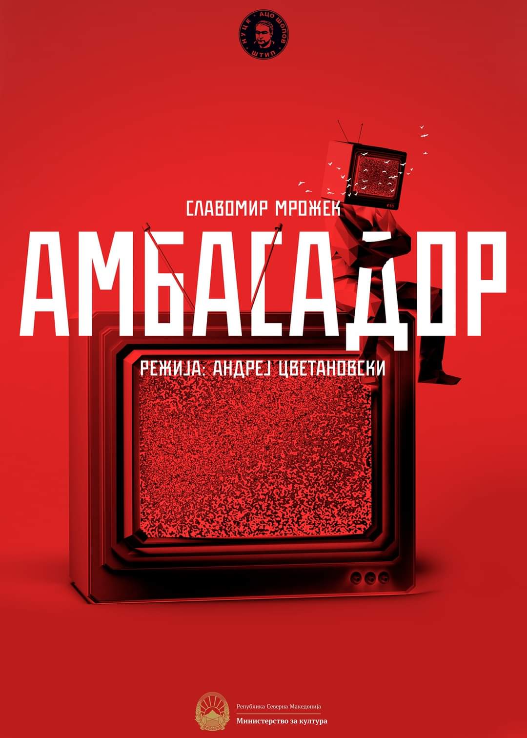 Амбасадор е работена по текст на Славомир Мрожек, режирана од Андреј Цветановски и водена од пет лика со голема техничка екипа.