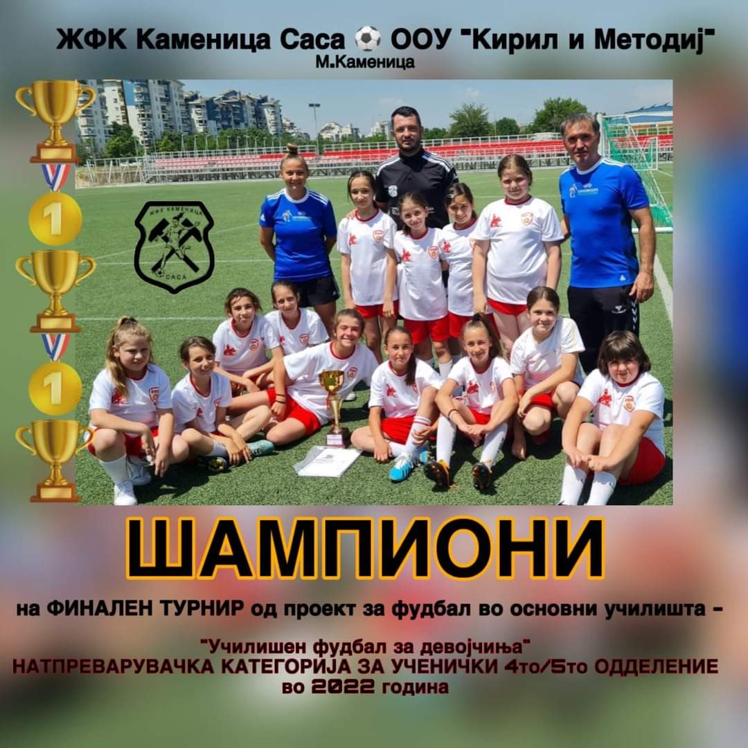 Во рамки на финалното натпреварување од Проектот за фудбал во државните основни училишта, девојчињата од Македонска Каменица, членови на ЖФК Каменица САСА и ученици во IV и V одделение при ООУ “Св. Кирил к Методиј” го освоија првото место и се нови шампиони на Македонија.
