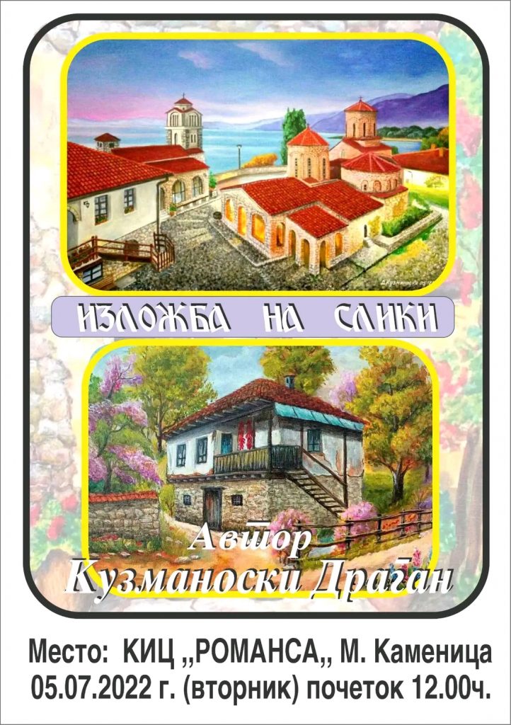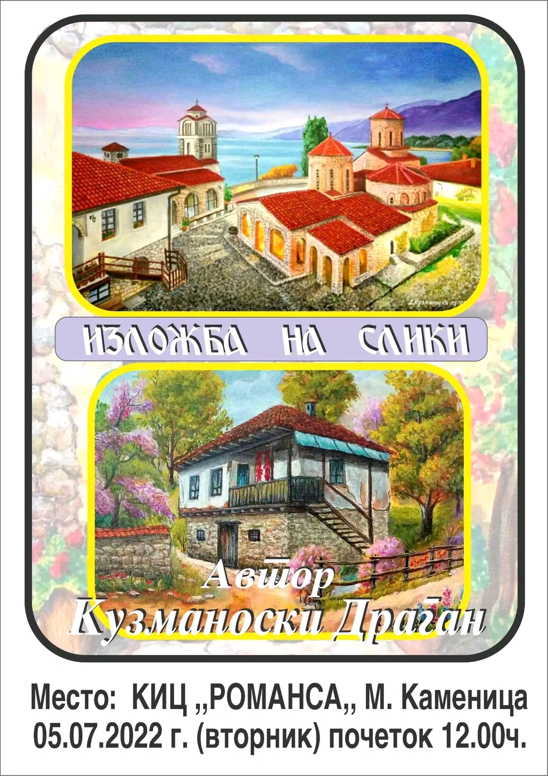 12:00 часот, 05. Јули 2022 година, е резервиран термин за отварање на Ликовна изложба на слики од авторот Драган Кузмановски во Домот на култура во Македонска Каменица.