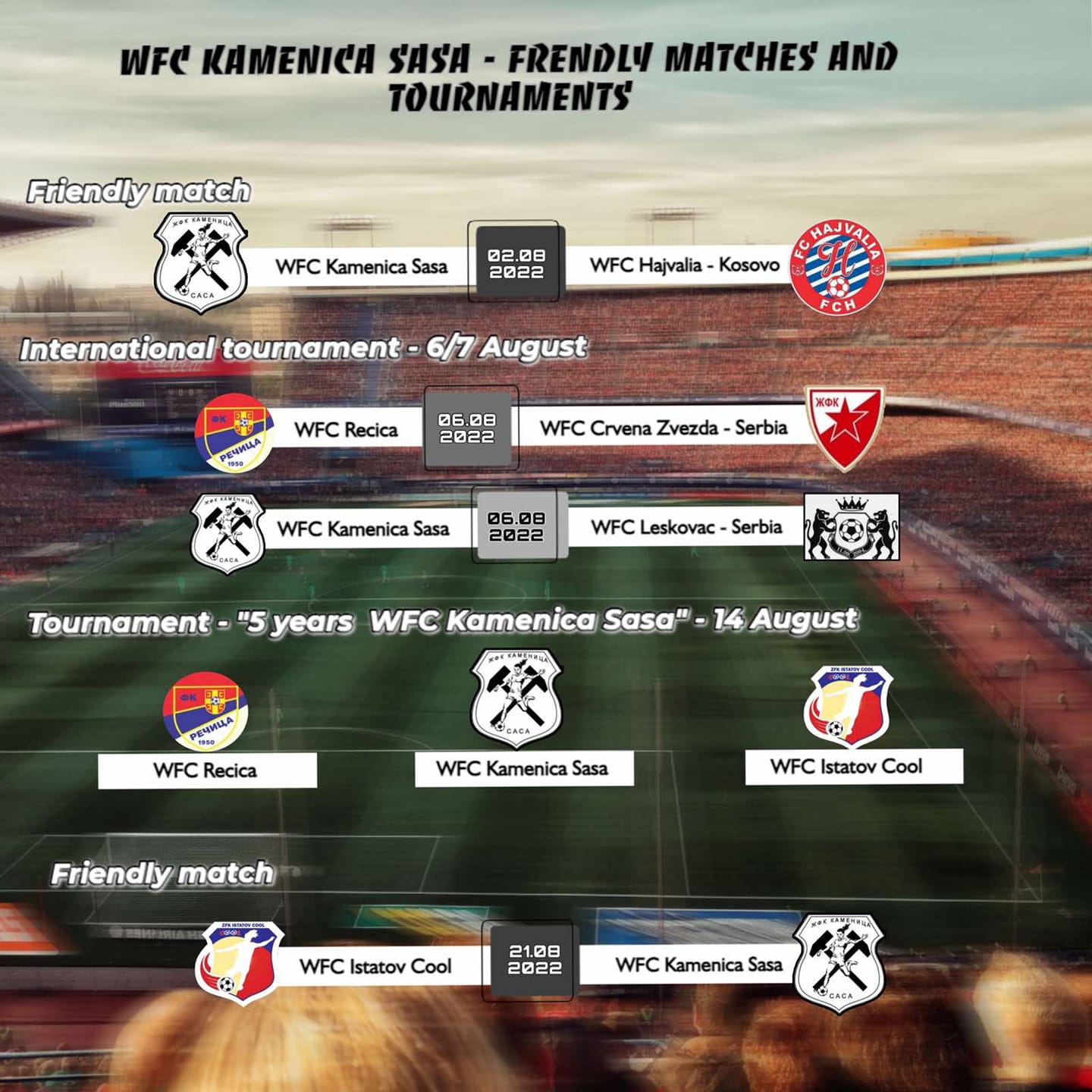 Првиот пријателски натпревар, ЖФК Каменица САСА ќе го игра пред домашна публика на 2. Август против шампионот на Косово, ЖФК Хајвалиа. Потоа, на 6 и 7 Август, како што стои во соопштението за јавност, „ЖФК Каменица САСА ќе учествува на Меѓународниот турнир во Куманово заедно со екипите на ЖФК Речица, ЖФК Црвена Звезда од Србија и ЖФК Лесковац од Србија“.