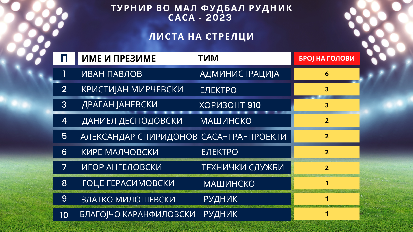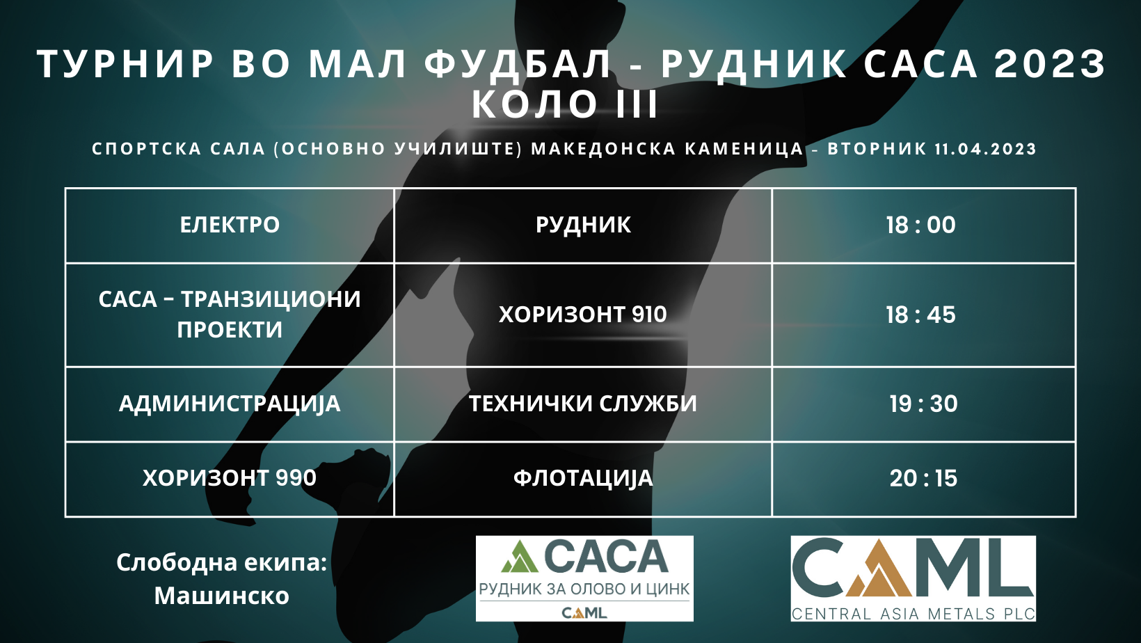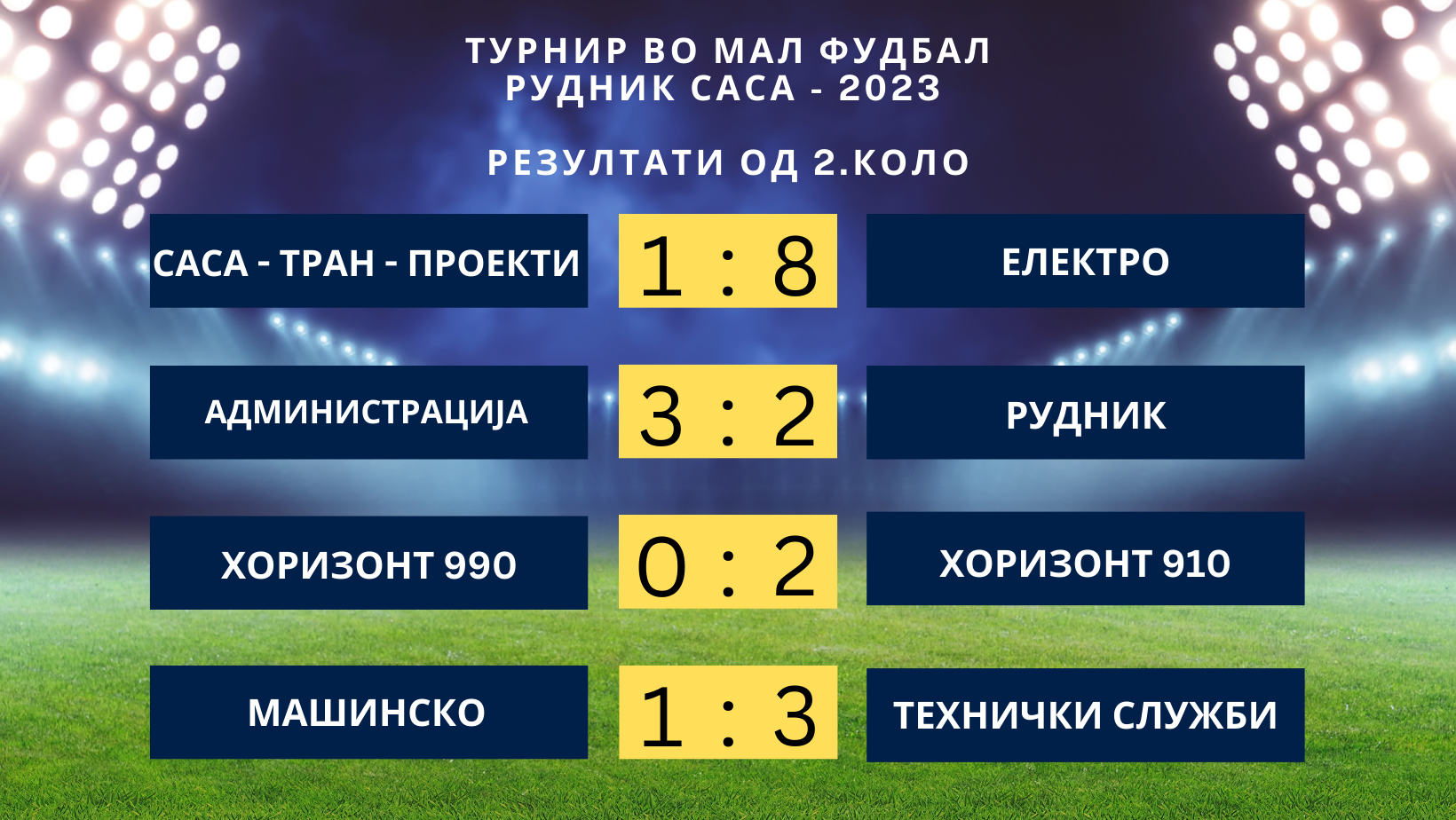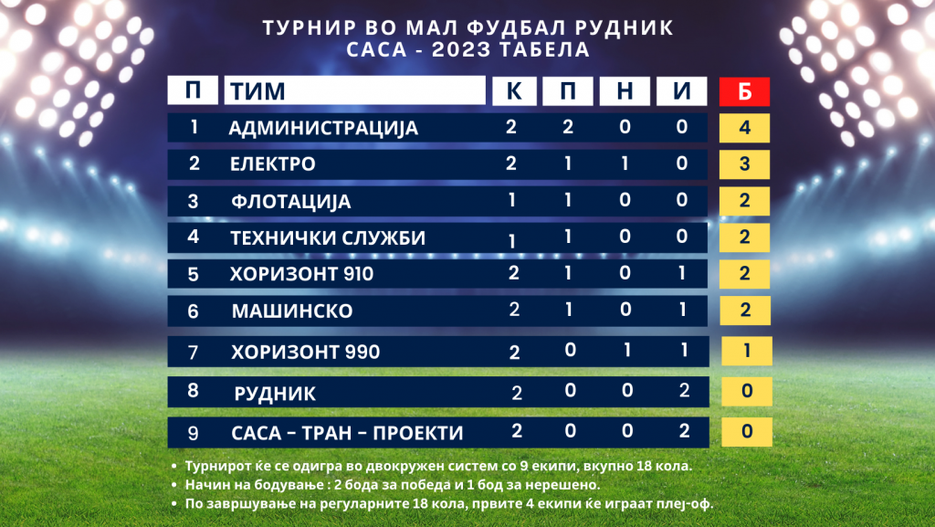 Македонска Каменица, 07. Април 2023 година – Вчера, се одигра 2. Коло од турнирот во мал фудбал Рудник САСА 2023. Во четирите натпевари победи извојуваа екипите на Електро над Саса транзициони проекти, Администрација со тесна гол разлика славеше над Рудник, Хоризонт 910 беше поуспешен од Хоризонт 990 и Технички служби ја совладаа екипата на Машинско.