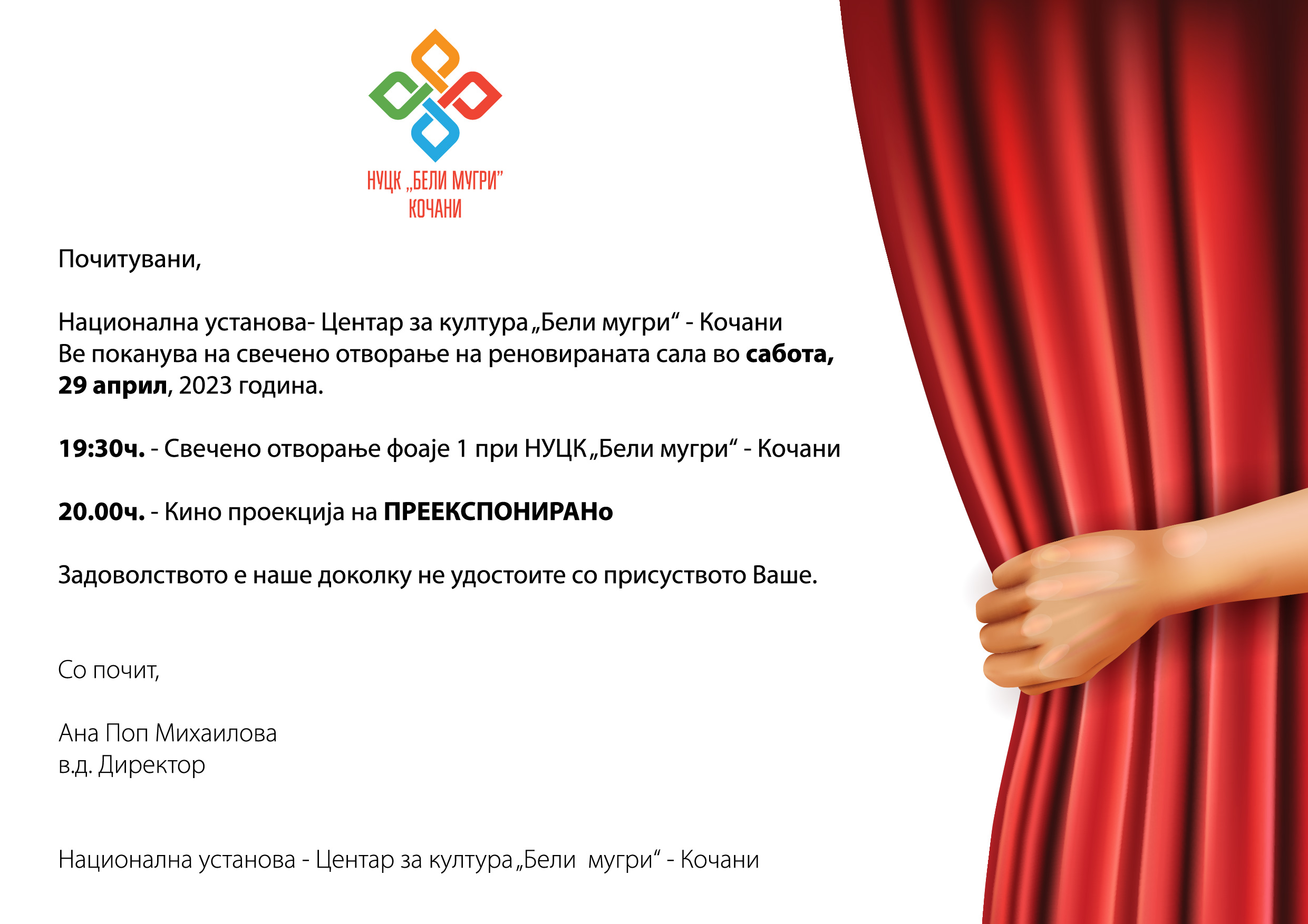 Свечено отварање на реконструираната сала во Националната установа Центар за култура “Бели мугри”- Кочани. Свеченоста по повод отварањето на реконструираната сала при НУЦК „Бели Мугри“ ќе започне во 19:30 часот, на 29. Април 2023 година.