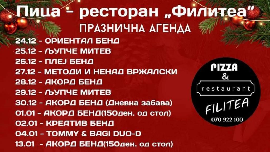 Одлична храна и добра музика – Пица-ресторан „Филитеа“ Кочани од денес па се до 05.01.2024год. со празнична агенда само за Вас.