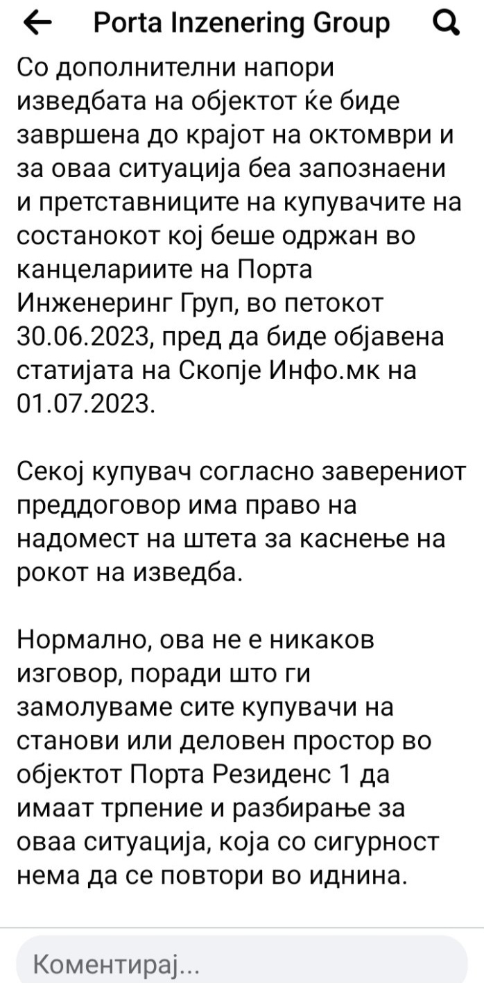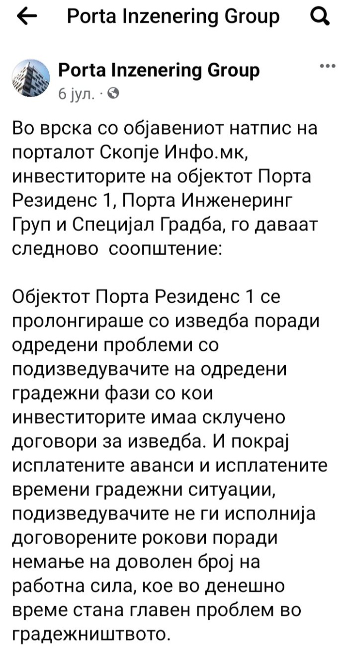 По напис на порталот https://skopjeinfo.mk/ „Порта Инженеринг“ излезе со соопштение на нивната официјална фб страна (06 јули 2023) во кое, признавајќи ја вината, гарантира дека крајниот рок за завршување на зградата ќе биде месец октомври 2023 година. Откако и ова не го исполнија соопштението беше отстрането.