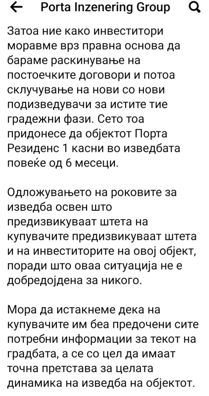 „ И покрај фактот што од „Порта Инженеринг“ сами упатија дека станарите имаат право на надомест на штета, на нашите барања за исплата на пенали согласно преддоговорите никој не одговара и нема никаква најава дека такво нешто воопшто ќе се случи.“ – вели станар кој има платено стан во оваа зграда.