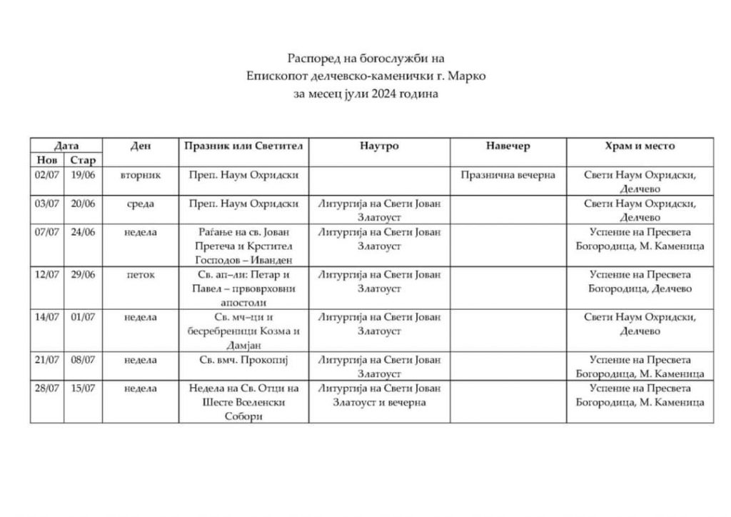 Распоред на богослужби за месец јули на Неговото Преосвештенство Епископот Делчевско-каменички г. Марко