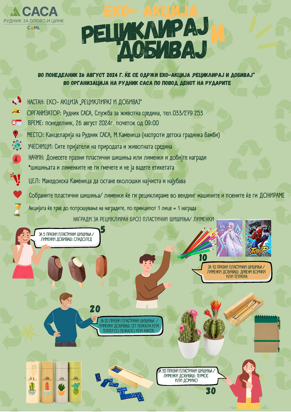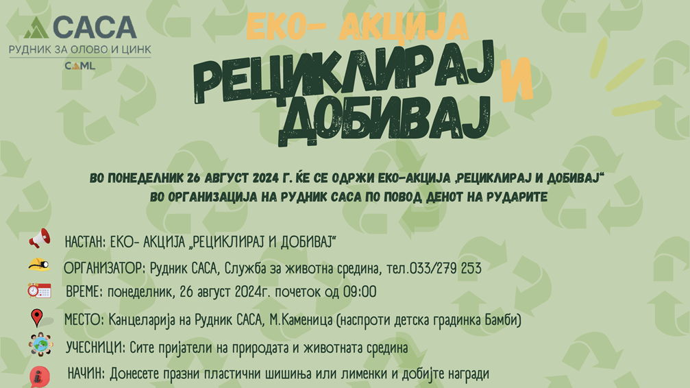 Во пресрет на Денот на рударите, на 26 август 2024 (понеделник), со почеток од 9:00 часот, ќе се одржи еко-акција „Рециклирај и добивај“ во организација на Рудник САСА. Настанот ќе се одржи пред Канцеларијата на Рудник САСА во Македонска Каменица (лоцирана спроти детска градинка „Бамби“), каде ќе биде поставен штанд на кој сите заинтересирани ќе можат да донесат празни пластични шишиња и/или лименки и за возврат да добијат пригодни награди и тоа: