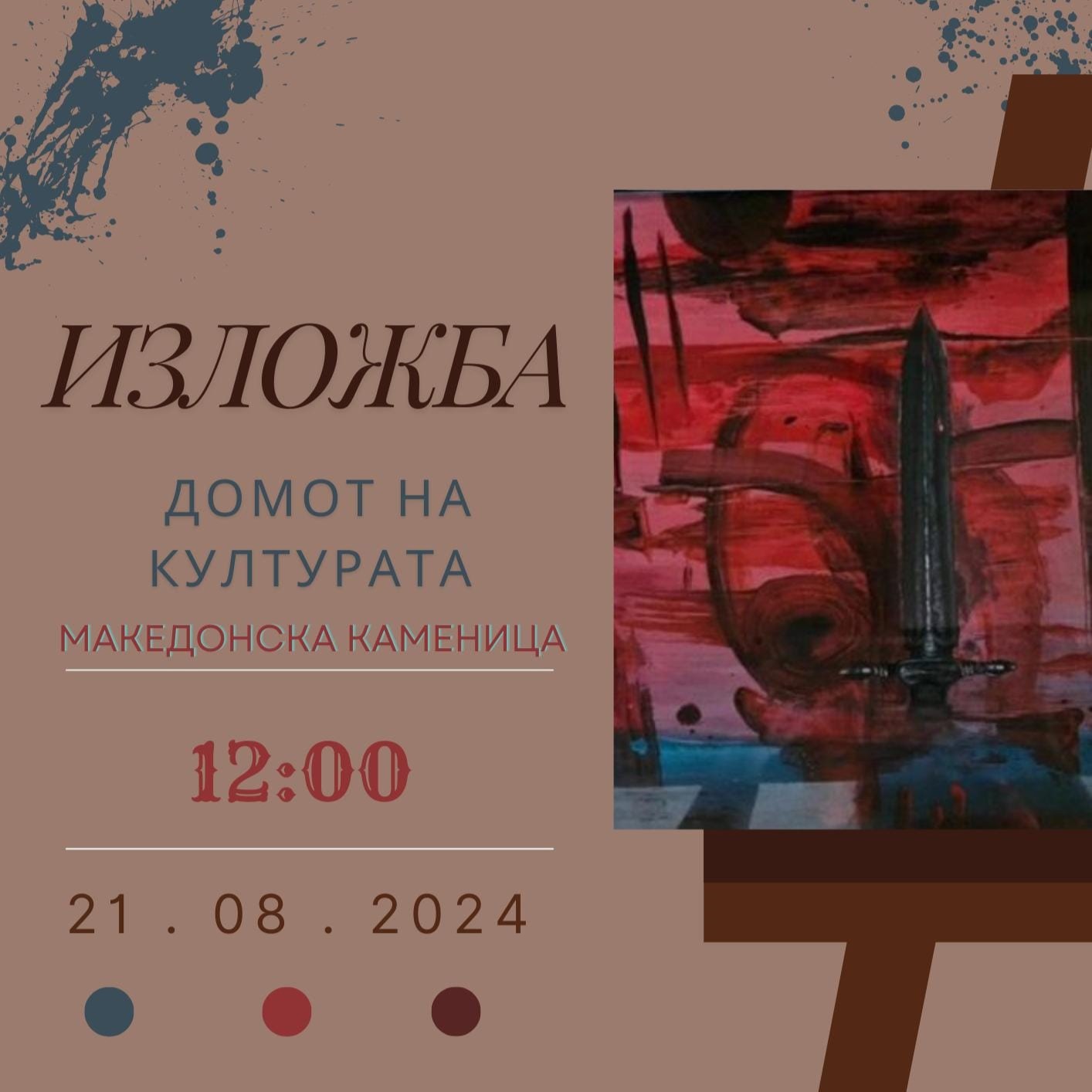 В среда, со почеток од 12 часот во Домот на култура во Македонска Каменица, ќе се одржи првата самостојна изложба на ликовни дела од Анастасија Стоименовска – млада и перспективна ликовна уметничка од Македонска Каменица.