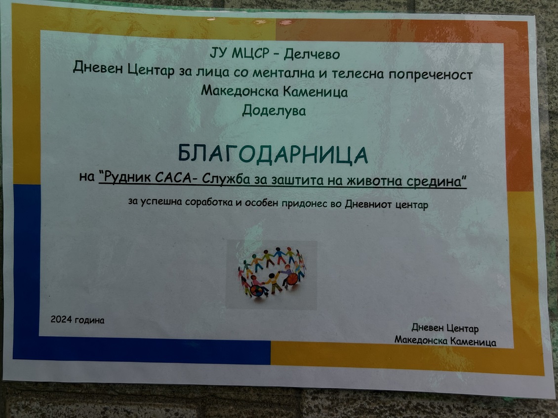 Дополнително, голем број вработени на рудникот САСА ја поддржаа еко-акцијата со свои доброволни индивидуални донации. Овие донирани средства помогнаа да се набават нови фотелји, маси и полици за Дневниот центар за лица со посебни потреби во Македонска Каменица, со што дополнително се унапредуваат условите за лицата кои престојуваат и се згрижени во оваа установа.