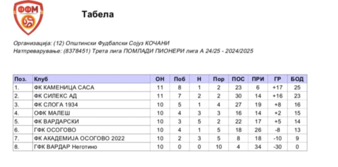 Македонска Каменица, 25. Ноември 2024 година – Фудбалскиот клуб Каменица Саса продолжува со вложување во развојот на идните фудбалски таленти, а оваа 2014/15 натпреварувачка сезона, помладите пионери и детските категории од генерацијата 2014/15 го покажаа најдоброто од себе. Со неверојатна упорност, борбеност, дисциплина и тимска игра овие детски категории ги освоија првите места во есенскиот дел од сезоната 2024/25.