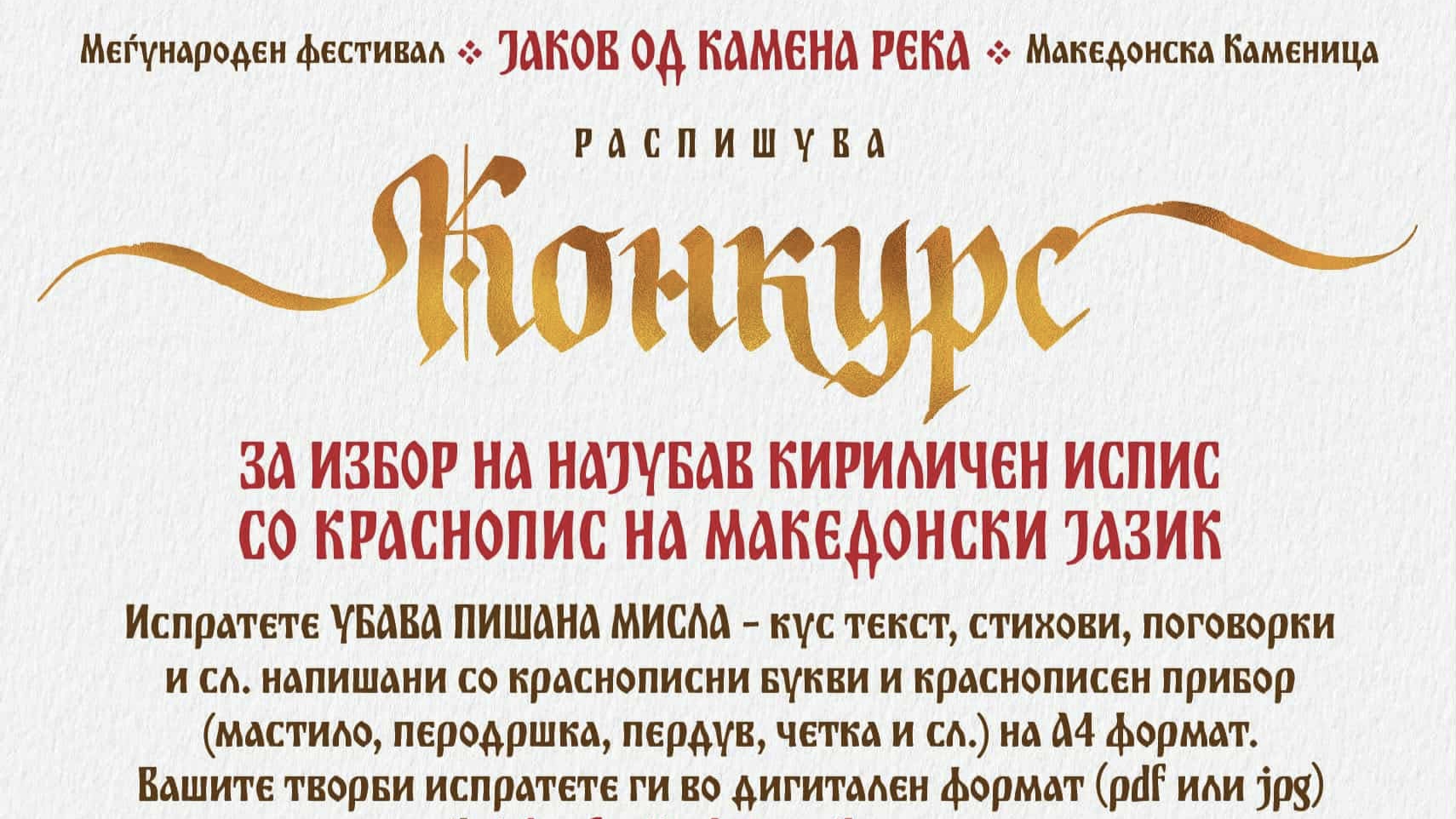 МАКЕДОНСКА КАМЕНИЦА – Меѓународниот фестивал „Јаков од Камена Река“ и оваа година го распишува традиционалниот Конкурс за избор на најубав кириличен испис со краснопис на македонски јазик.