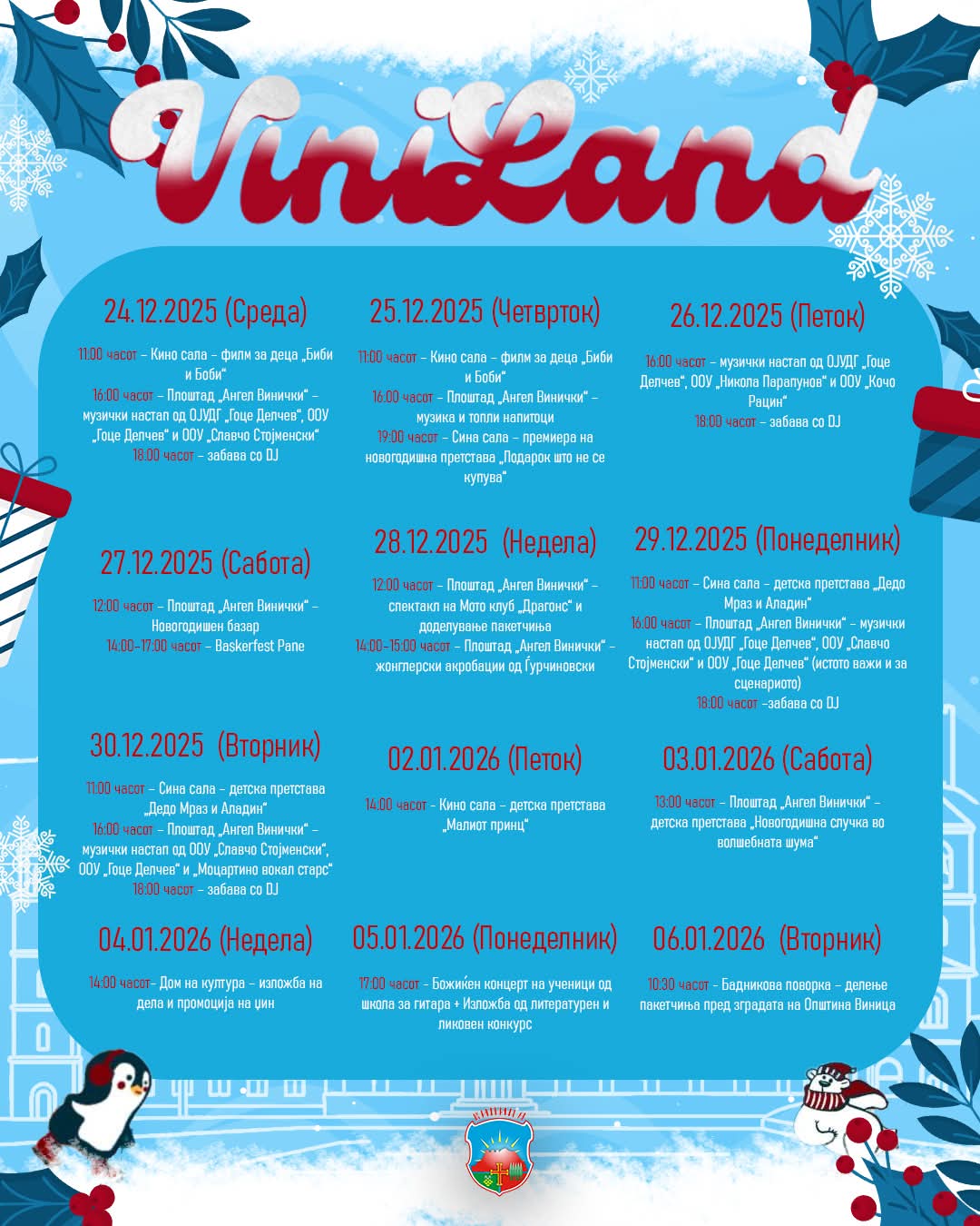 Програмата ќе понуди разновидни настани, забави и изненадувања за сите генерации, со цел Виница да блесне во празнично светло и да донесе насмевки на лицата на на сите наши граѓани, од најмали до највозрасни.