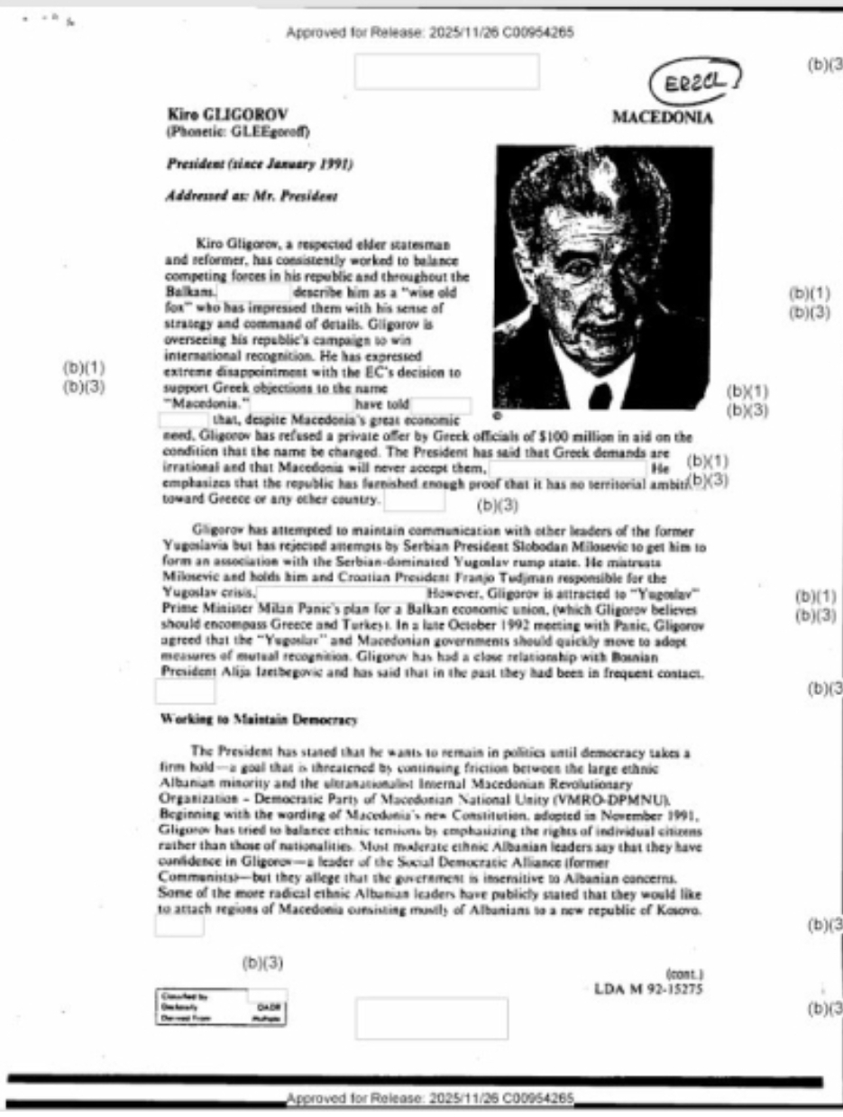 Во документот на ЦИА од ноември 1992 година, се дадени детали за тоа каде се движела Македонија како новоформирана држава во тоа време, по отцепувањето од поранешната федерална Југославија со нејзиниот нов лидер.