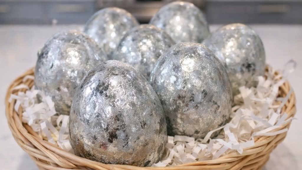 После тоа, подгответе ја фолијата, исечете ја на соодветни парчиња, премачкајте ја со белка од јајце, а потоа внимателно завиткајте ја околу јајцата. Резултатот? Сребрени јајца кои ќе ја украсат секоја празнична маса.