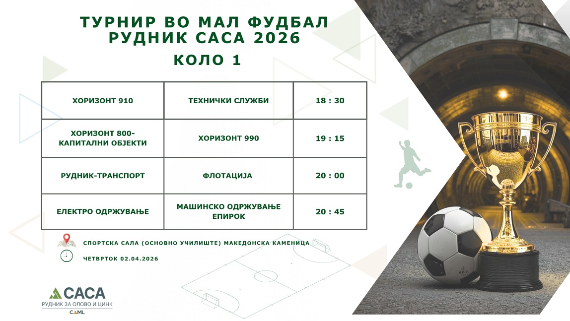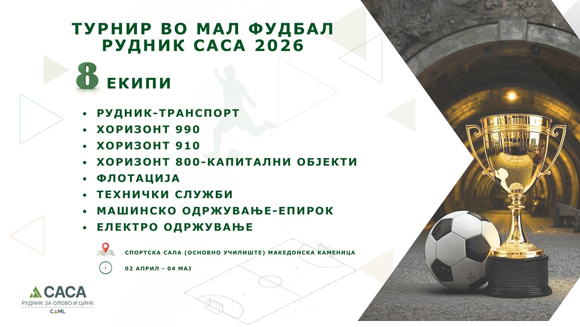 Македонска Каменица, 01. Април 2026 година – Во организација на Рудник САСА, од 2 април до 4 мај 2026, ќе се одржи годинешниот турнир во мал фудбал „Рудник САСА 2026“, на кој, во едномесечно пријателско натпреварување, ќе учествуваат тимови составени од вработени во рудникот.